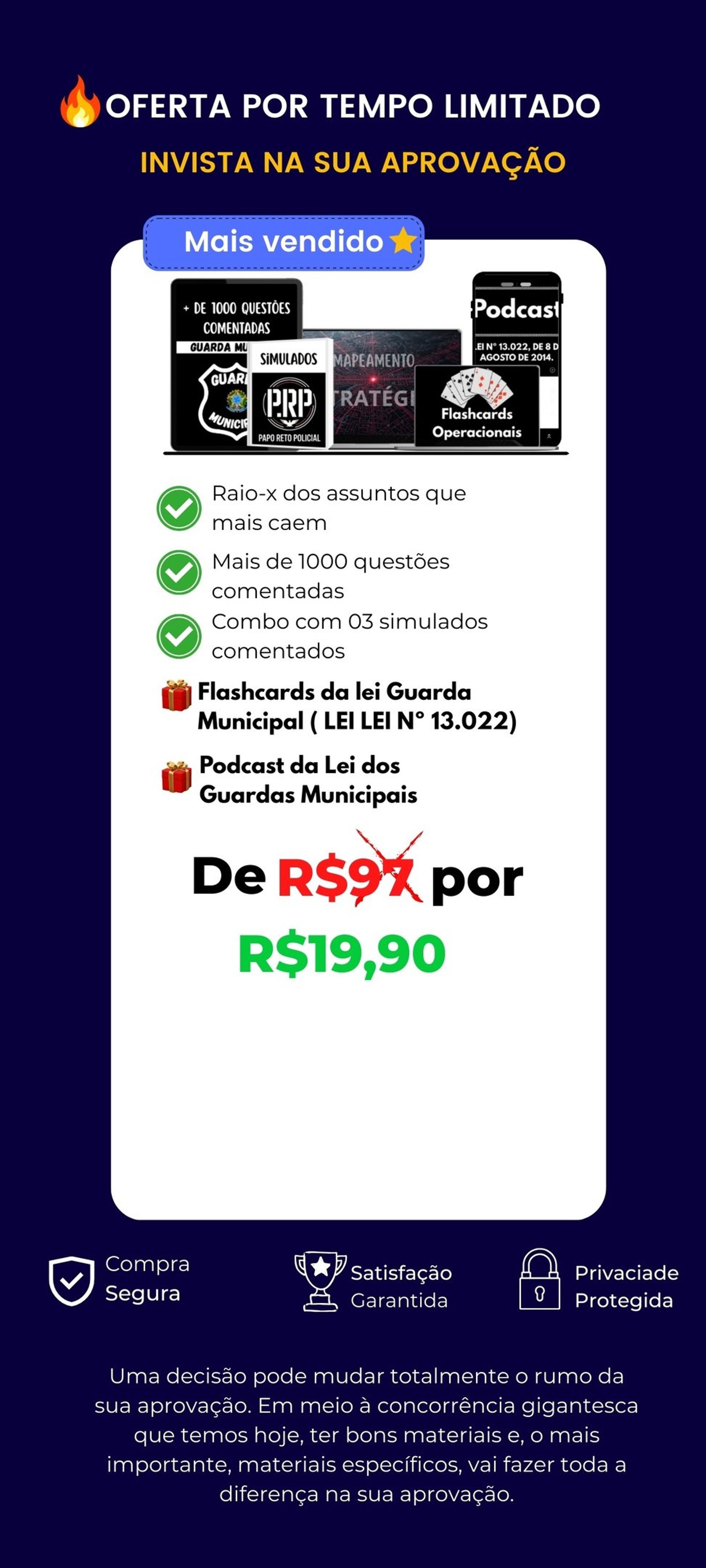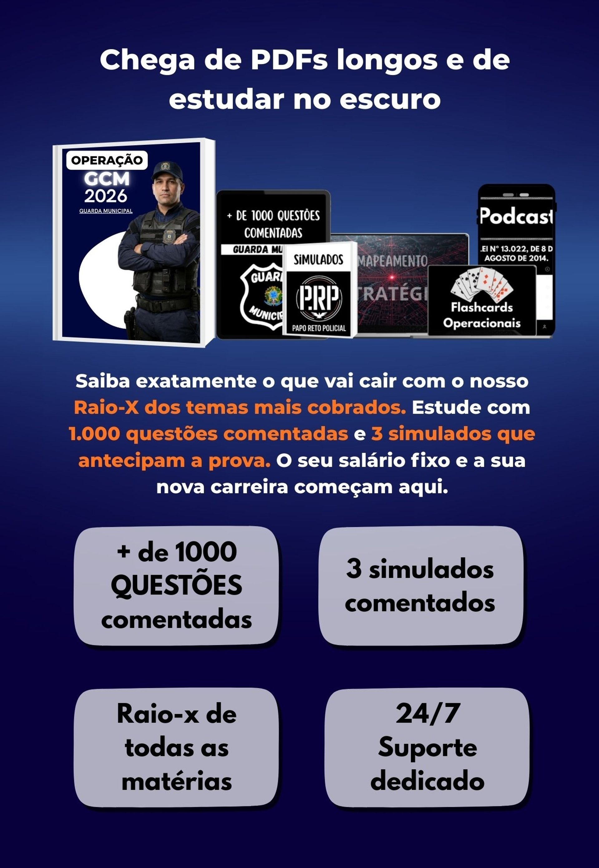 É um ecossistema de aprovação completo para Guardas Municipais. O combo inclui o Raio-X Estratégico (assuntos que mais caem), 1.000+ Questões Comentadas para fixação e 3 Simulados Autorais e Comentados que replicam a experiência real da prova.